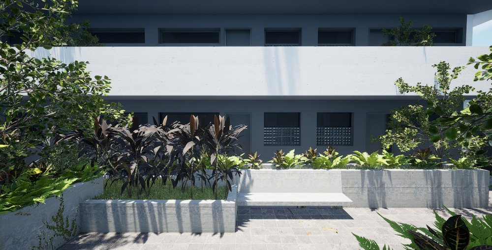 paisagismo com os volumes arquitetônicos suavizam e trazem vida ao empreendimento, já que ao sair de casa conviveremos com a natureza logo